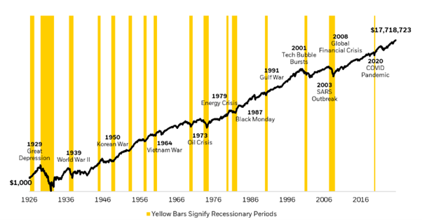 On long-term market growth, the chart below shows how $1,000 invested in the US stock market in 1926 would have grown by 2024, alongside recessions over the same period.
